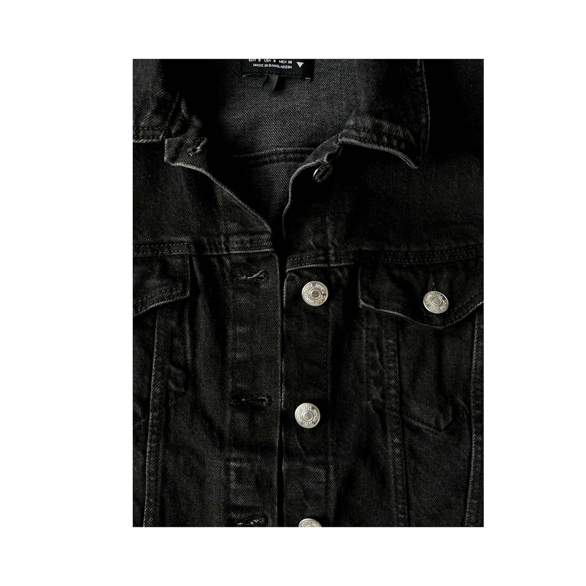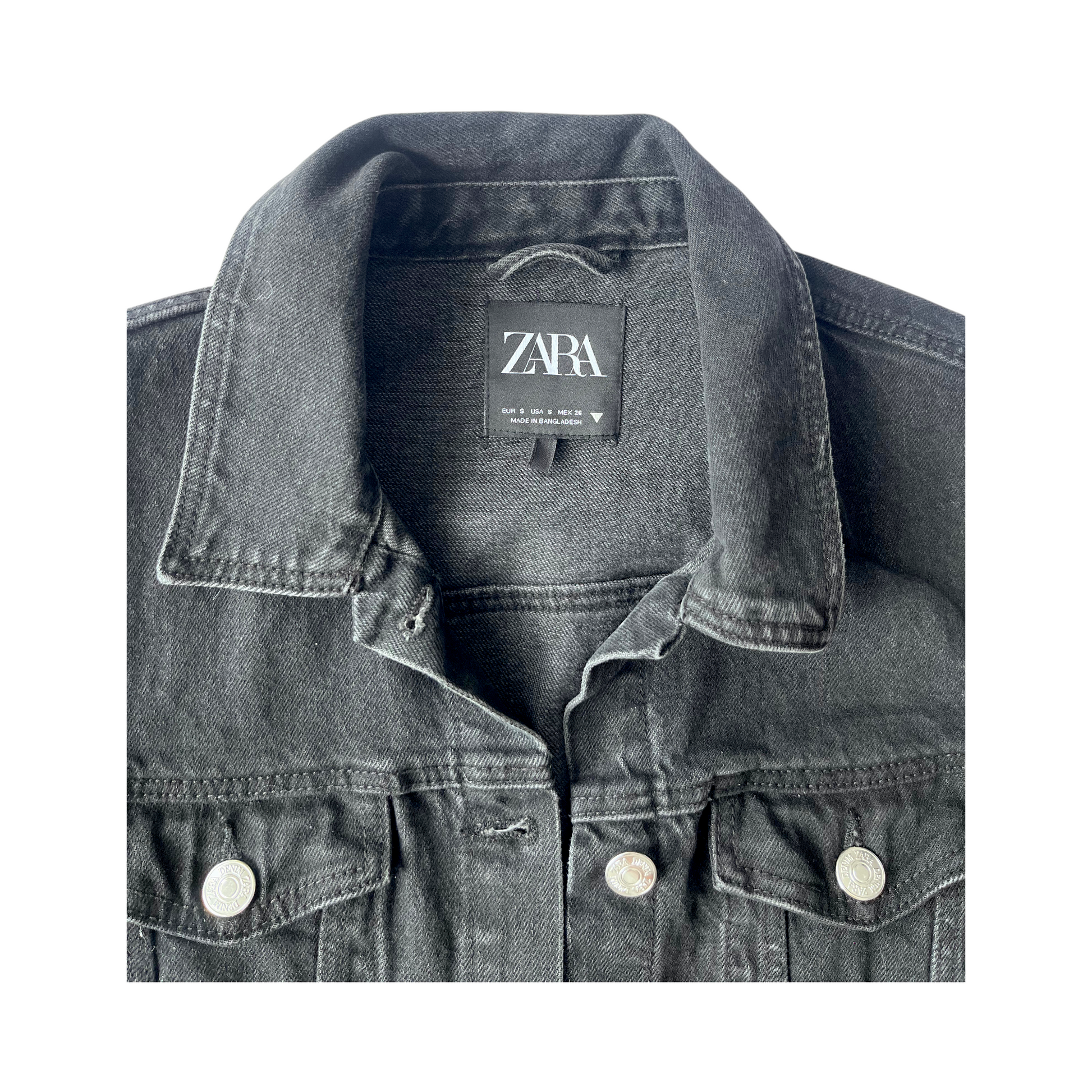 Chaqueta Zara confeccionada en mezclilla negra, de corte clásico y estructura ajustada. Cuenta con cierre frontal de botones metálicos, bolsillos superiores con solapa y costuras verticales que estilizan la silueta. Una prenda atemporal, perfecta para complementar looks casuales o elevar conjuntos básicos. Su acabado negro le da un toque moderno y versátil.
