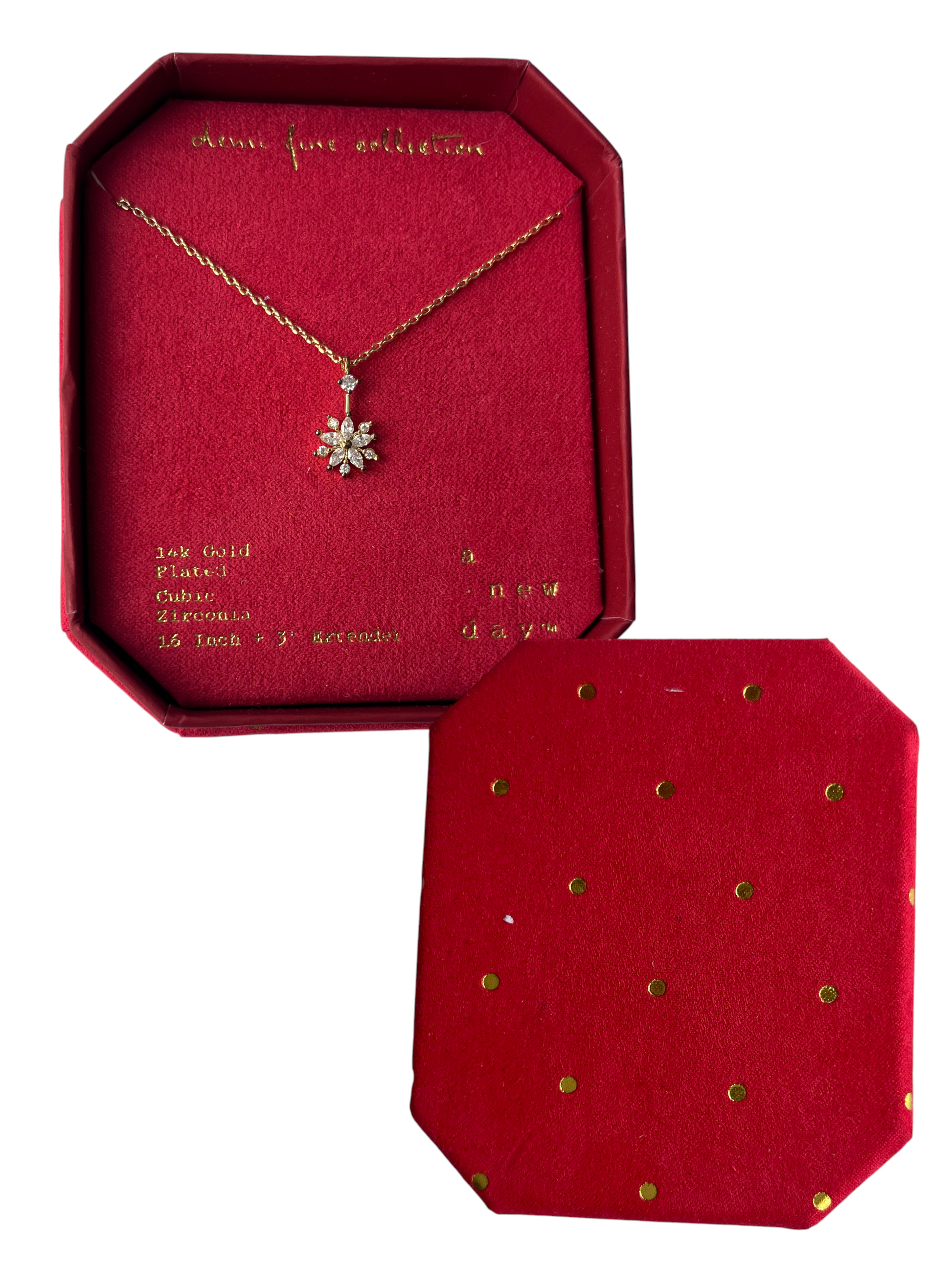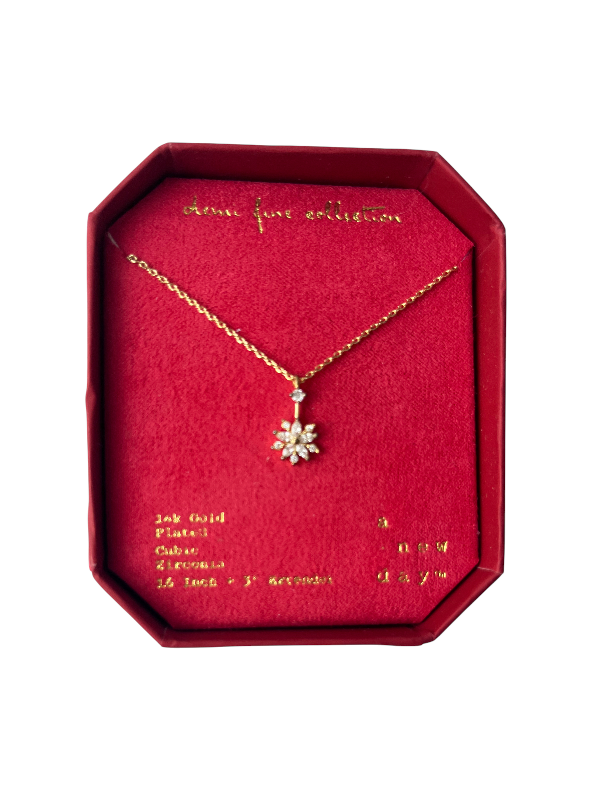 Gargantilla A New Day – Demi Fine Collection, con dije en forma de flor brillante elaborado con zirconias cúbicas. Pieza bañada en oro de 14K (14K Gold Plated), con un diseño delicado y elegante. Se presenta en su estuche original rojo, ideal para regalo.