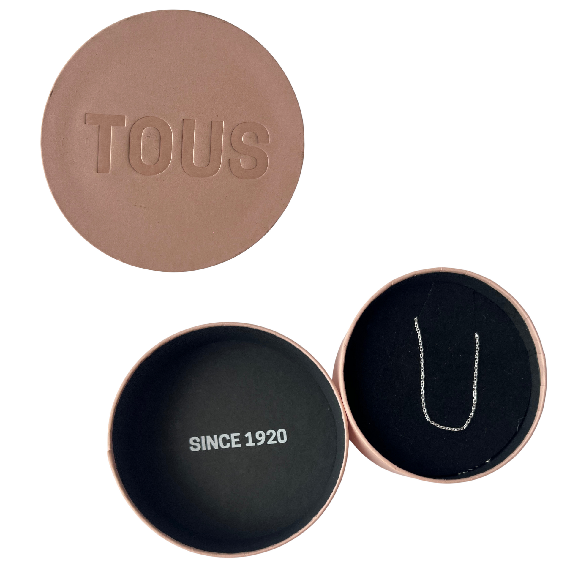 Gargantilla TOUS elaborada en plata de ley, con el icónico dije del osito TOUS en miniatura (en la parte de atrás) . Se entrega con su empaque original completo: caja redonda color nude con interior negro, bolsa fucsia con asas negras y folleto oficial. Diseño minimalista y elegante, ideal para uso diario o como regalo especial.