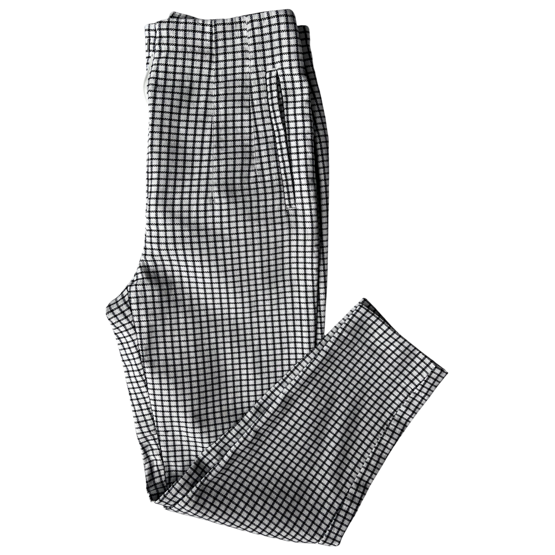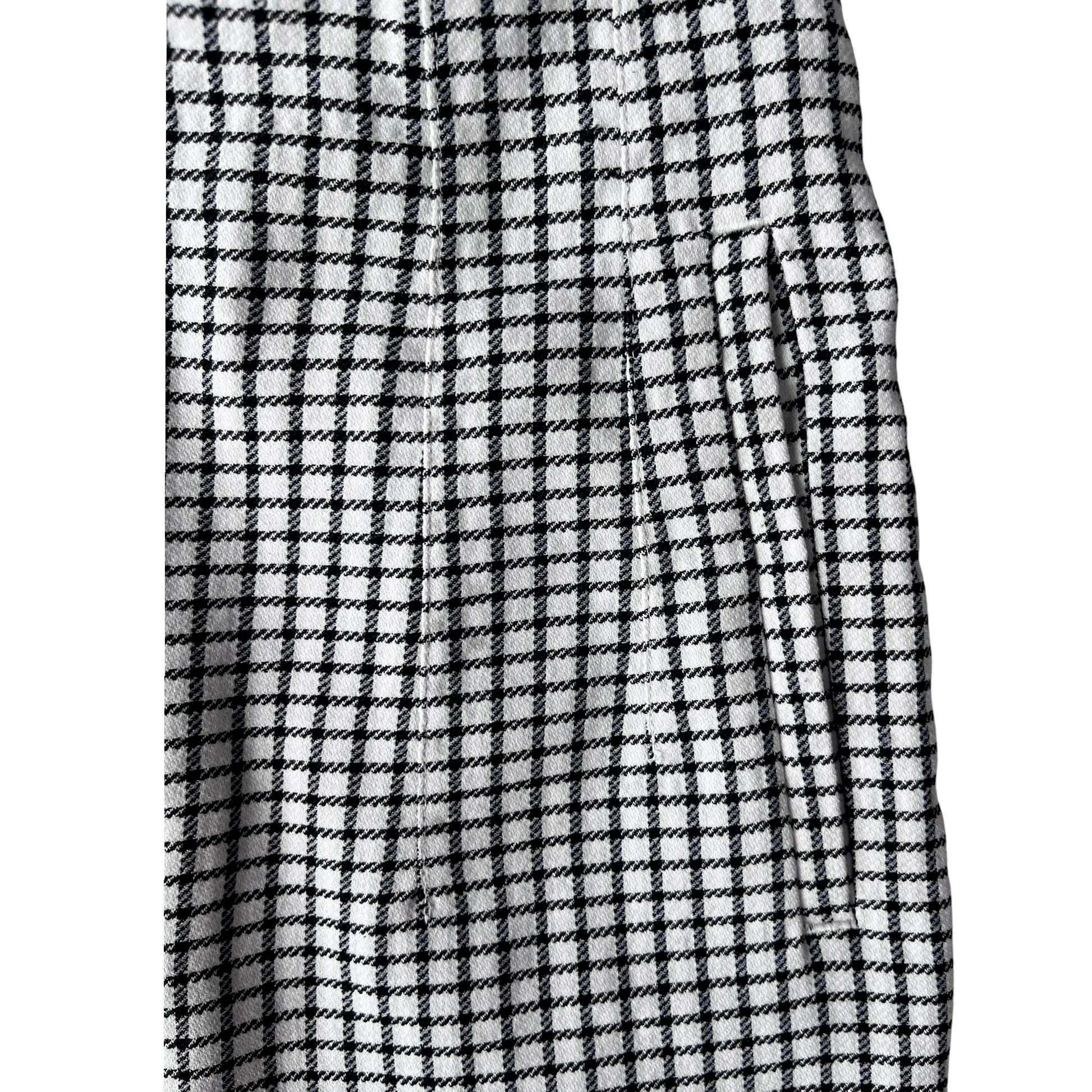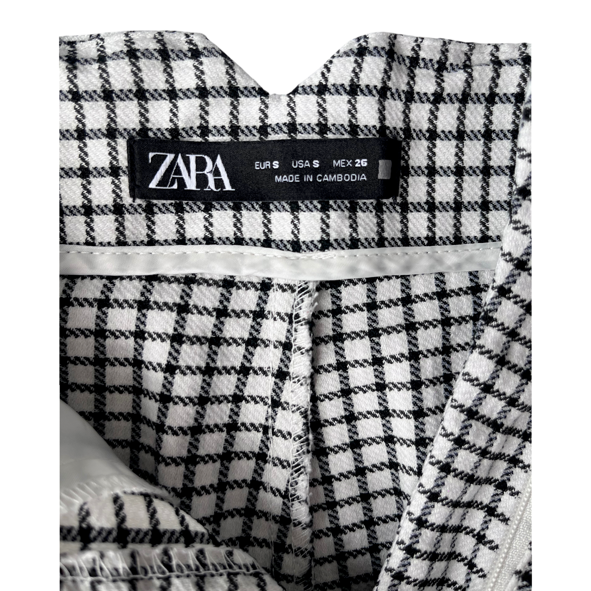 Pantalón Zara en tejido estructurado con estampado de cuadros blanco y negro. Corte recto con pinzas frontales que aportan un ajuste elegante y favorecedor. Presenta cierre con cremallera y botón oculto, además de bolsillos laterales funcionales. Su diseño atemporal y versátil lo convierte en una prenda ideal tanto para looks formales como casuales con un toque sofisticado.