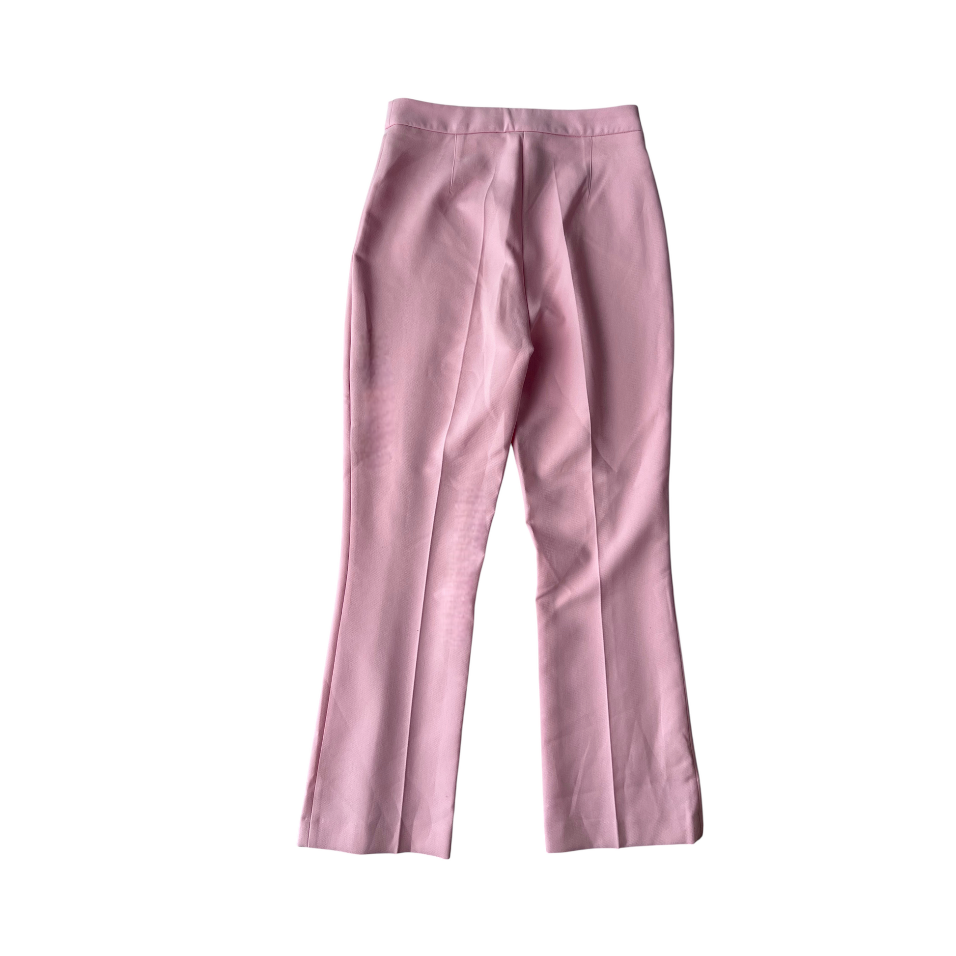 Pantalón ZARA confeccionado en un tono rosa suave, con corte flare (ligeramente acampanado) y talle alto. Presenta pliegues marcados al frente y cierre oculto con gancho interno y cremallera. Con un acabado estructurado y elegante. Ideal para ocasiones formales o looks de oficina con estilo.