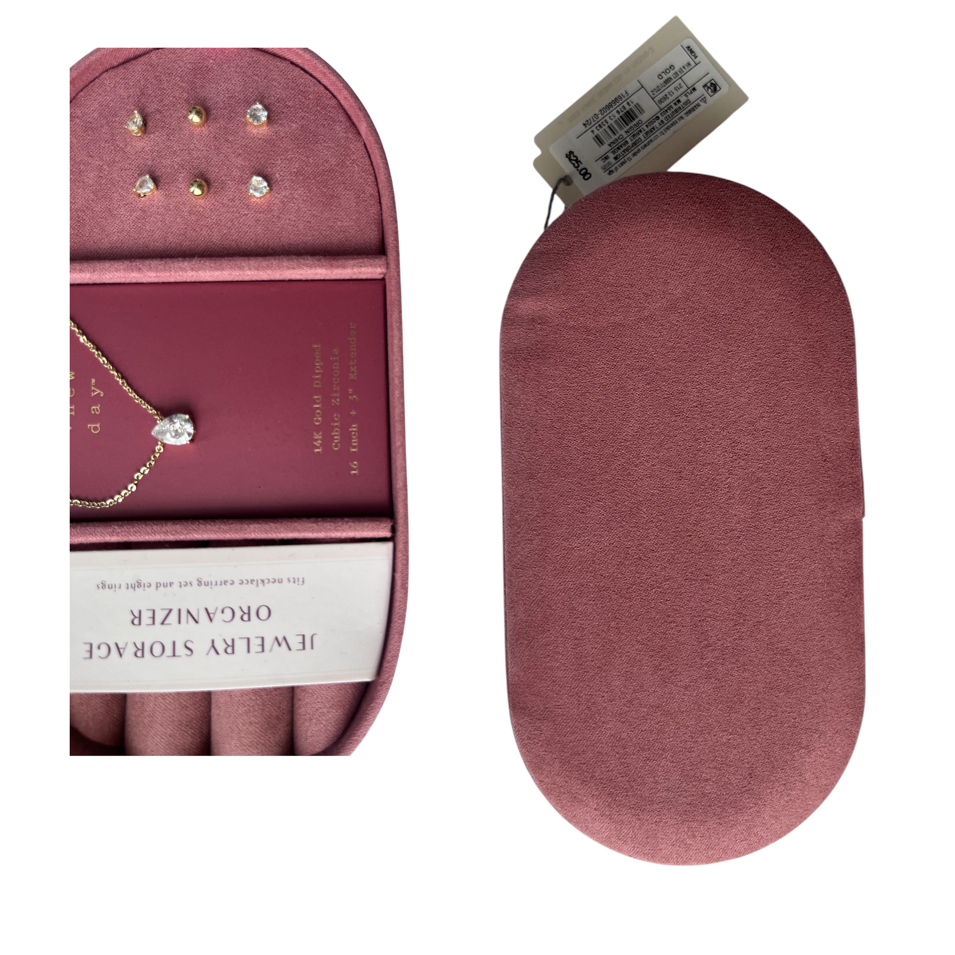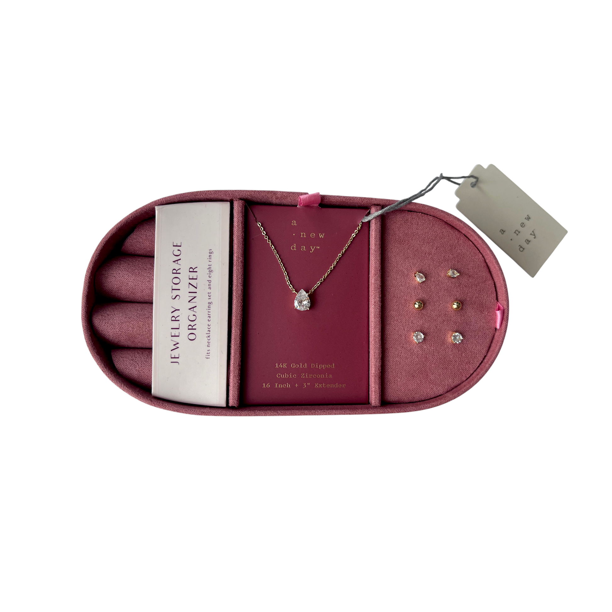 Set de joyería A New Day que incluye una gargantilla con dije en forma de gota y tres pares de aretes (dos con zirconias cúbicas y uno tipo bolita dorada). Todas las piezas están bañadas en oro de 14K (14K gold dipped). Se presenta en un elegante estuche de terciopelo rosa tipo organizador de joyas, ideal para viaje o regalo.